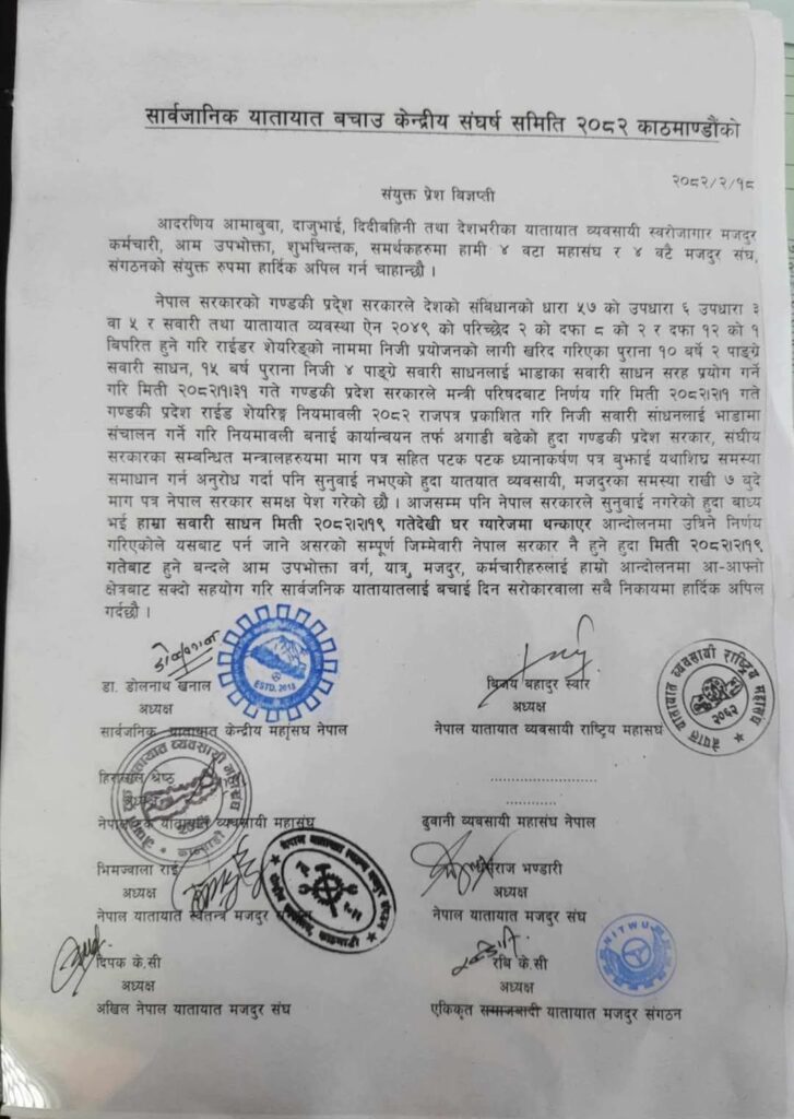 गण्डकी प्रदेश सरकारले ‘राइड सेयरिङ’को नाममा निजी प्रयोजनका लागि खरिद गरिएका सवारी साधनलाई पनि भाडाका सवारी साधनसरह प्रयोग गर्न दिने गरी ल्याएको नियमावली खारेजीको माग गर्दै केही दिनअघिदेखि व्यवसायीले गण्डकी प्रदेशमा यातायात बन्द गर्दै आएका थिए।
