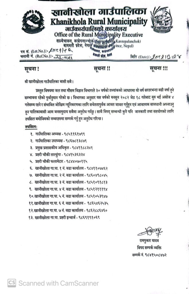 काभ्रेको खानीखोला पालिकामा एकै दिन दुई सुचना, विपद आइलागे यसमा गर्नुहोस् सम्पर्क