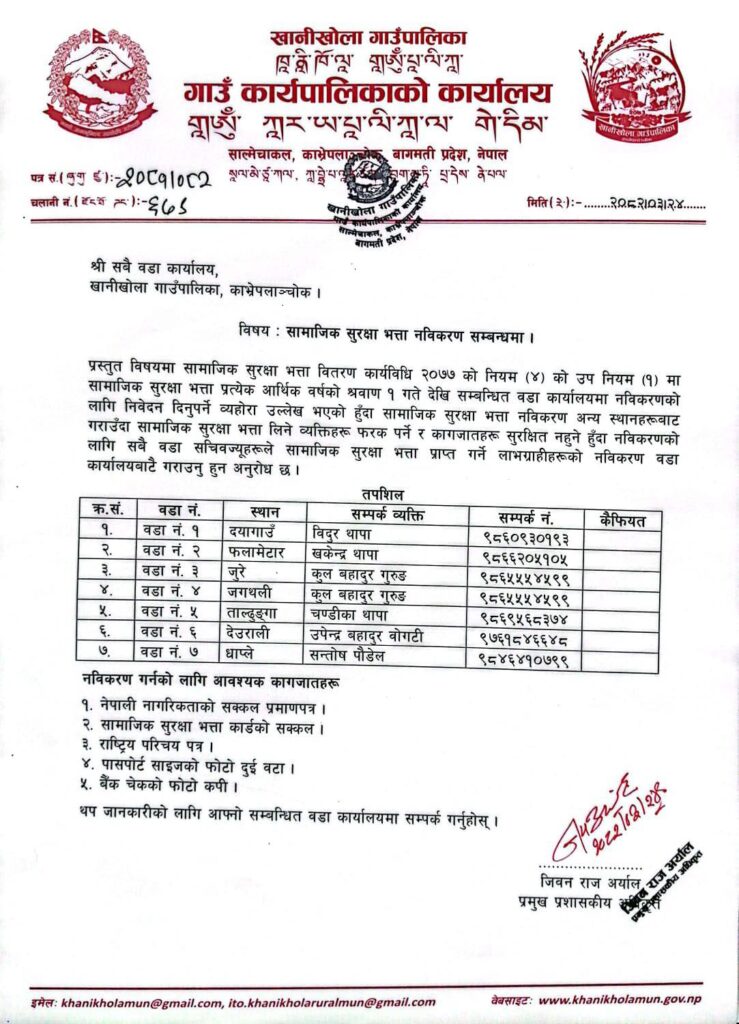 पालिकाले वर्खायाममा आउनसक्ने विपदको पुर्व जनाकारी, सतर्कता र आवश्यक सहयोगको लागि भन्दै गाउँपालिका अध्यक्षदेखि वडाका प्रतिनिधि, प्रहरी र स्वास्थ्यसेवाको लागि सम्पर्क गर्न भन्दै सम्पर्क नम्बर र नामहरु सार्वजन्ीक गरेको छ भने सामाजिक सुरक्षा भत्ताको कार्ड