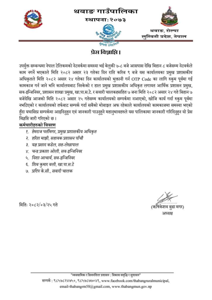 ‘असार २४ गतेका दिन कार्यालयको भुक्तानी गर्न ‘ओटिपी कोड’का लागि रुकुम पूर्वमा गई कामकाज गर्न जाने भनि कार्यालयबाट निस्केको र हालः प्रमुख प्रशासकीय अधिकृतलगायत आर्थिक प्रशासन प्रमुख, सव-इन्जिनियर, प्रशासन शाखा प्रमुख, खा.पा.स.टे. र सवारी चालकहसहित ७ जना असार २४ गते बिहान ७ बजेदेखिहालसम्म कार्यालयको सम्पर्कमा नआएको विज्ञप्तिमा उल्लेख छ।