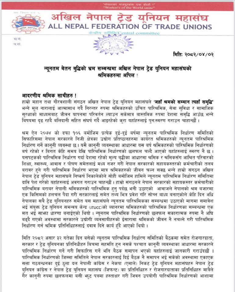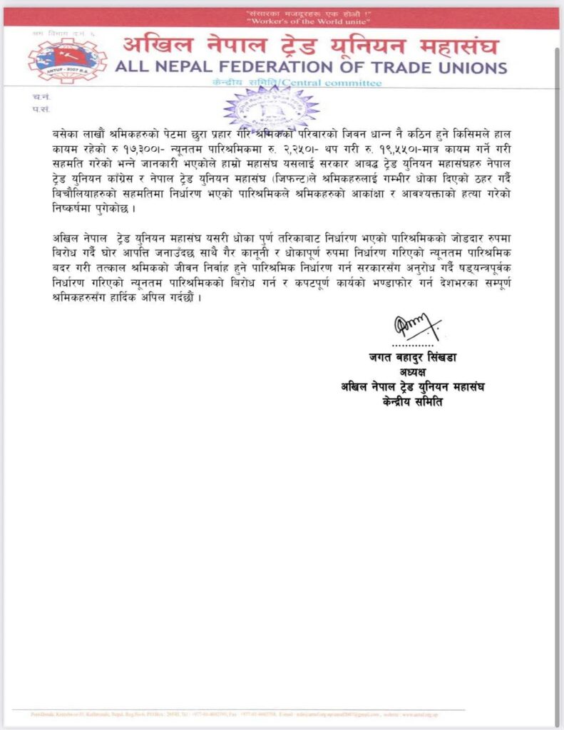 सरकारले गरेकाे श्रमिककाे न्युनतम पारिश्रमिक जिवन धान्न नपुग्ने भएको भन्दै नेकपा माओवादी निकट ट्रेड युनियन महासंघले साे निर्णय धाेकापुर्ण भएको बताएको छ ।