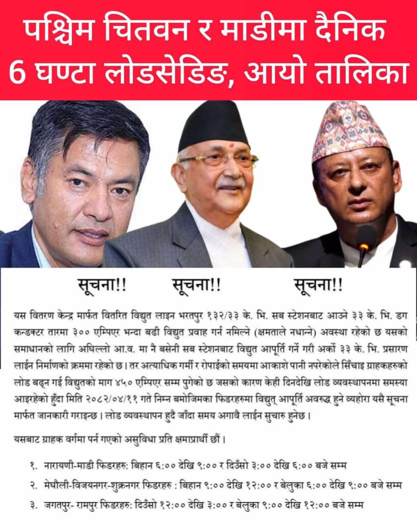 प्राधिकरणले नारायणी- माडी फिडर, मेघाैली विजयनगर शुक्रनगर फिडर र जगतपुर रामपुर फिडरमा विहान र बेलुकी क्रमशः ३/३ घण्टा लाेडसेडिङकाे तालिका सार्वजनिक गरेको हाे ।