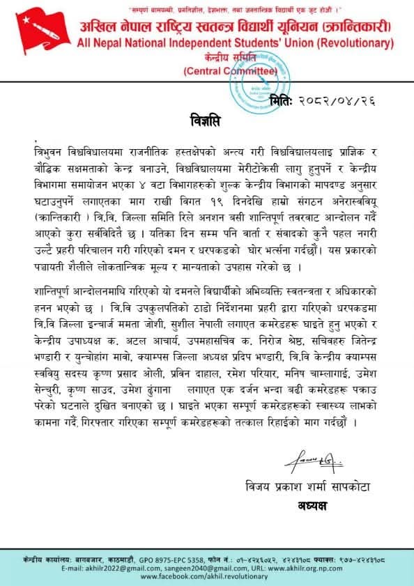 नेकपा माओवादी केन्द्र निकट अखिल क्रान्तिकारीका अध्यक्ष विजयप्रकाश सापकोटाले एक विज्ञप्ति जारी गर्दै विश्वविद्यालयमा राजनीतिक हस्तक्षेपको अन्त्य गरी विश्वविद्यालयलाई प्राज्ञिक थलाे बनाउन, मेरिटाेक्रेसी लागु गर्न र केन्द्रीय विभागमा समायाेजन भएका ४ वटा विभागकाे मुल्य घटाउनुपर्ने माग राखी शान्तिपूर्ण आन्दोलनमा उत्रिएका विद्यार्थीहरूमाथिकाे दमन अभिव्यक्ति स्वतन्त्रता र अधिकारकाे हनन् भएको बताएका छन् ।