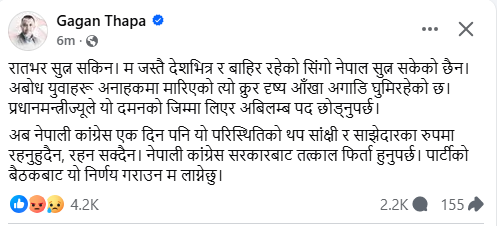 थापाले हालैको दमनका कारण आफू र सिङ्गो नेपाल नै रातभर सुत्न नसकेको बताएका छन् । उनले ‘अबोध युवाहरू अनाहकमा मारिएको त्यो क्रूर दृश्य’ आफ्नो आँखा अगाडि घुमिरहेको उल्लेख गरेका छन्।उनले कांग्रेस अब एक दिन पनि यो परिस्थितिको थप साक्षी र साझेदारको रूपमा रहन नसक्ने बताएका छन्। उनले पार्टीको बैठकबाट सरकारबाट फिर्ता हुने निर्णय गराउन आफू लाग्ने प्रतिबद्धता पनि व्यक्त गरेका छन्।