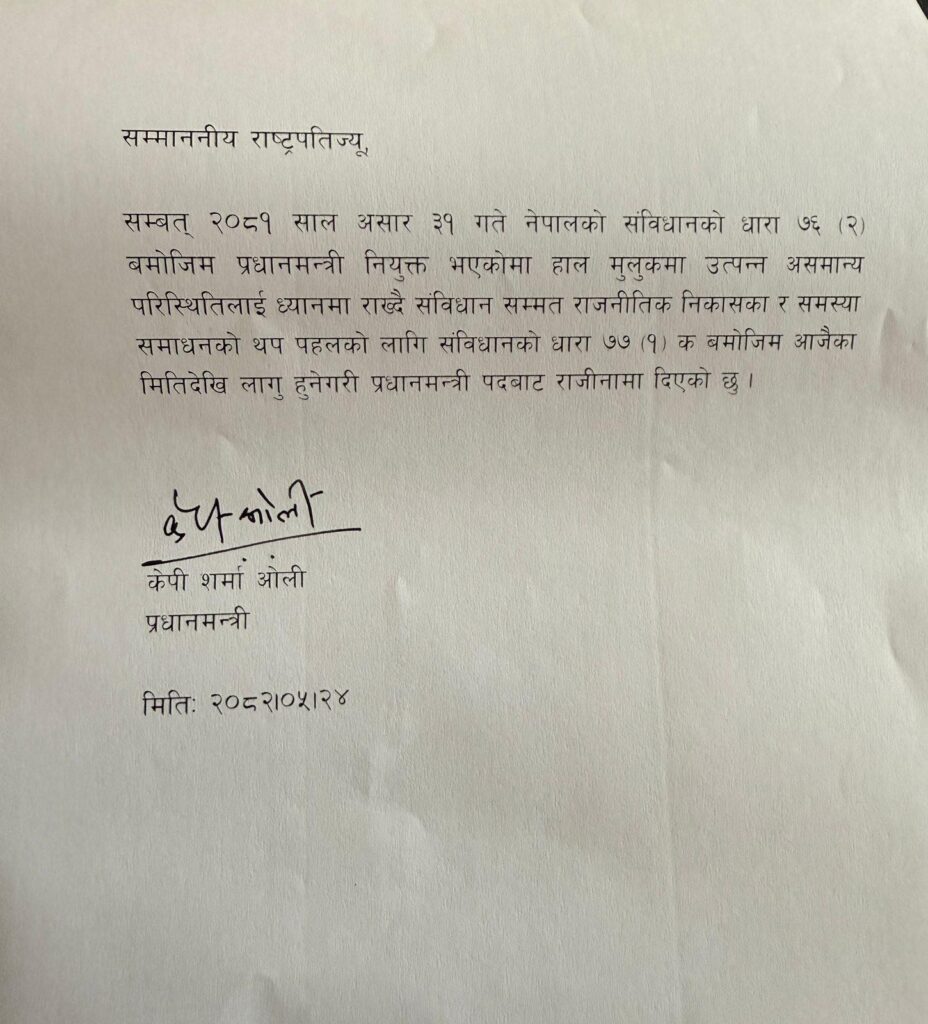 ‘सम्माननीय राष्ट्रपतिज्यू, संवत् २०८१ साल असार ३१ गते नेपालको संविधानको धारा ७६ (२) बमोजिम प्रधानमन्त्री नियुक्त भएकोमा हाल मुलुकमा उत्पन्न असामान्य परिस्थितिलाई ध्यानमा राख्दै संविधान सम्मत राजनीतिक निकासका र समस्या समाधानको थप पहलको लागि संविधानको धारा ७७ (१) क बमोजिम आजैका मितिदेखि लागु हुनेगरी प्रधानमन्त्री पदबाट राजीनामा दिएको छु’, ओलीको पत्रमा भनिएको छ । जेनजीको आन्दोलन नियन्त्रणबाहिर पुगेसँगै ओली राजीनामा दिन बाध्य भएका हुन् ।