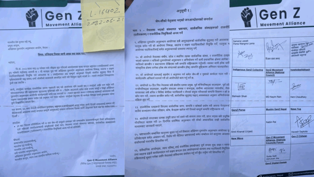 केही जेनजी अभियन्ताहरूले मंगलबार अख्तियार दुरुपयोग अनुसन्धान आयोग पुगेर प्रमुख प्रेमकुमार राई लगायतको राजीनामाकाे माग सहित उजुरी दर्ता गराएका हुन् । दर्ता गराएपछि प्रतिक्रिया दिँदै यसअघि उनीहरूले प्रधानमन्त्री कार्यालय, कानुन मन्त्रालय लगायत सरोकारवाला निकायहरूलाई बोधार्थसहित इमेल पनि पठाइसकिएको बताए । ‘त्यही प्रक्रियामा आज हामीले यो दर्ता गरेका छौं,’ अभियन्ताहरूले भने ।