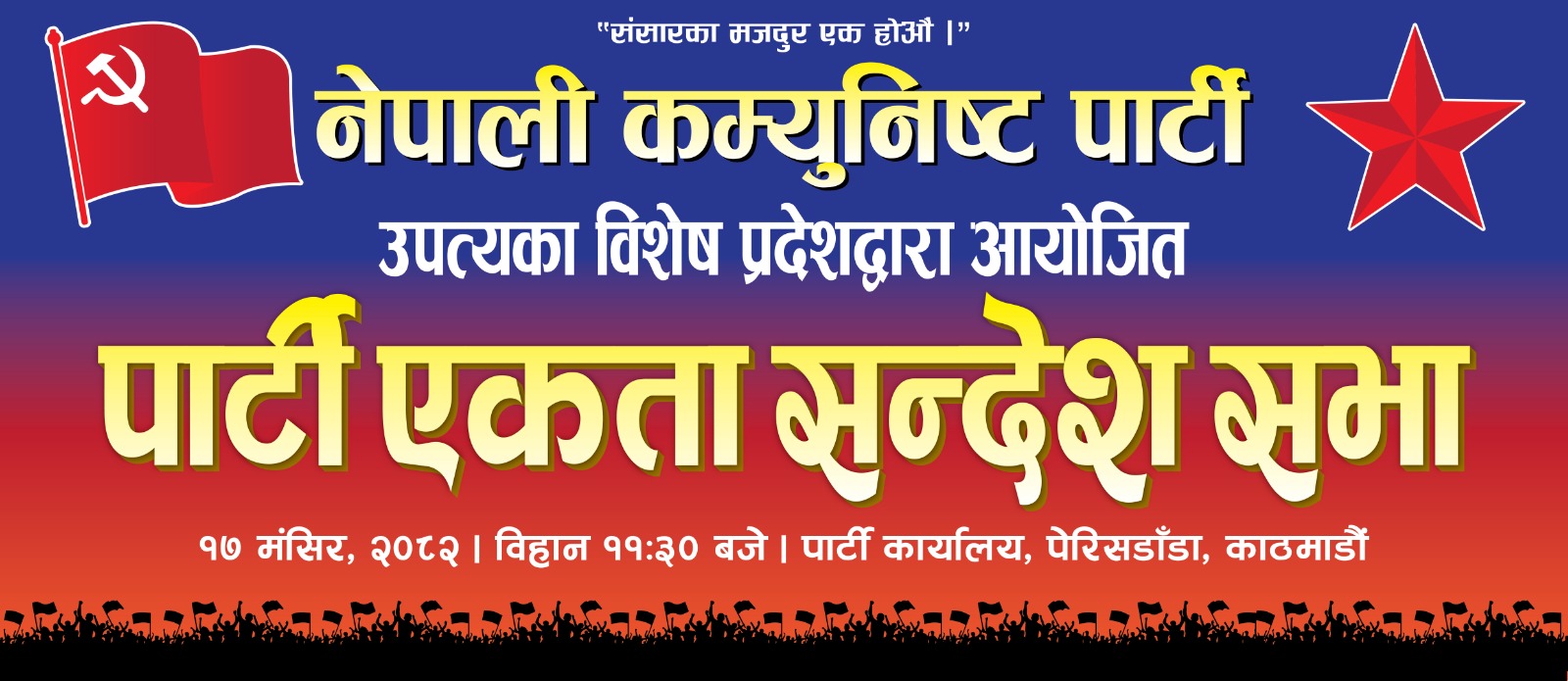 नेपाली कम्युनिस्ट पार्टीकाे उपत्यका विशेष प्रदेशकाे एकता सन्देश सभा पेरिसडाँडामा हुने भएको छ ।