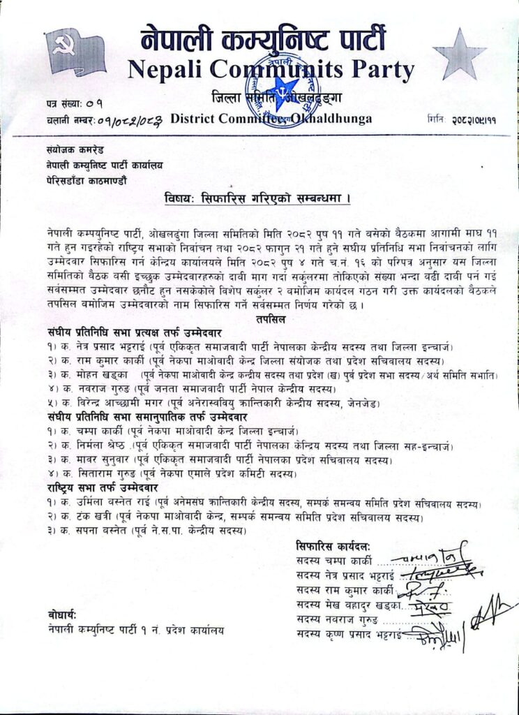 नेपाली कम्युनिस्ट पार्टीकाे केन्द्रीय कार्यलयकाे परिपत्रअनुसार निर्माण भएको कार्यदलको शनिबार बिहान बसेको बैठकले प्रत्यक्ष तथा समानुपातिक तर्फ उम्मेदवारहरूको नाम सर्वसम्मत रुपमा सिफारिस गरेको हो ।