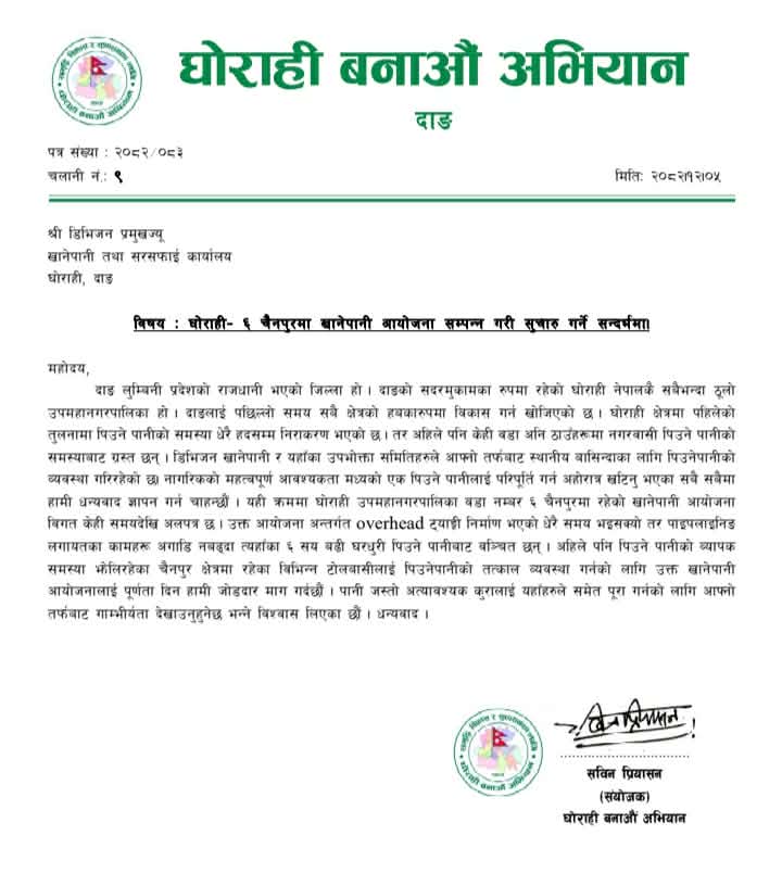 ६ सय घरलाई खानेपानीको व्यवस्था गर्न घोराही बनाऔँ अभियानद्वारा माग