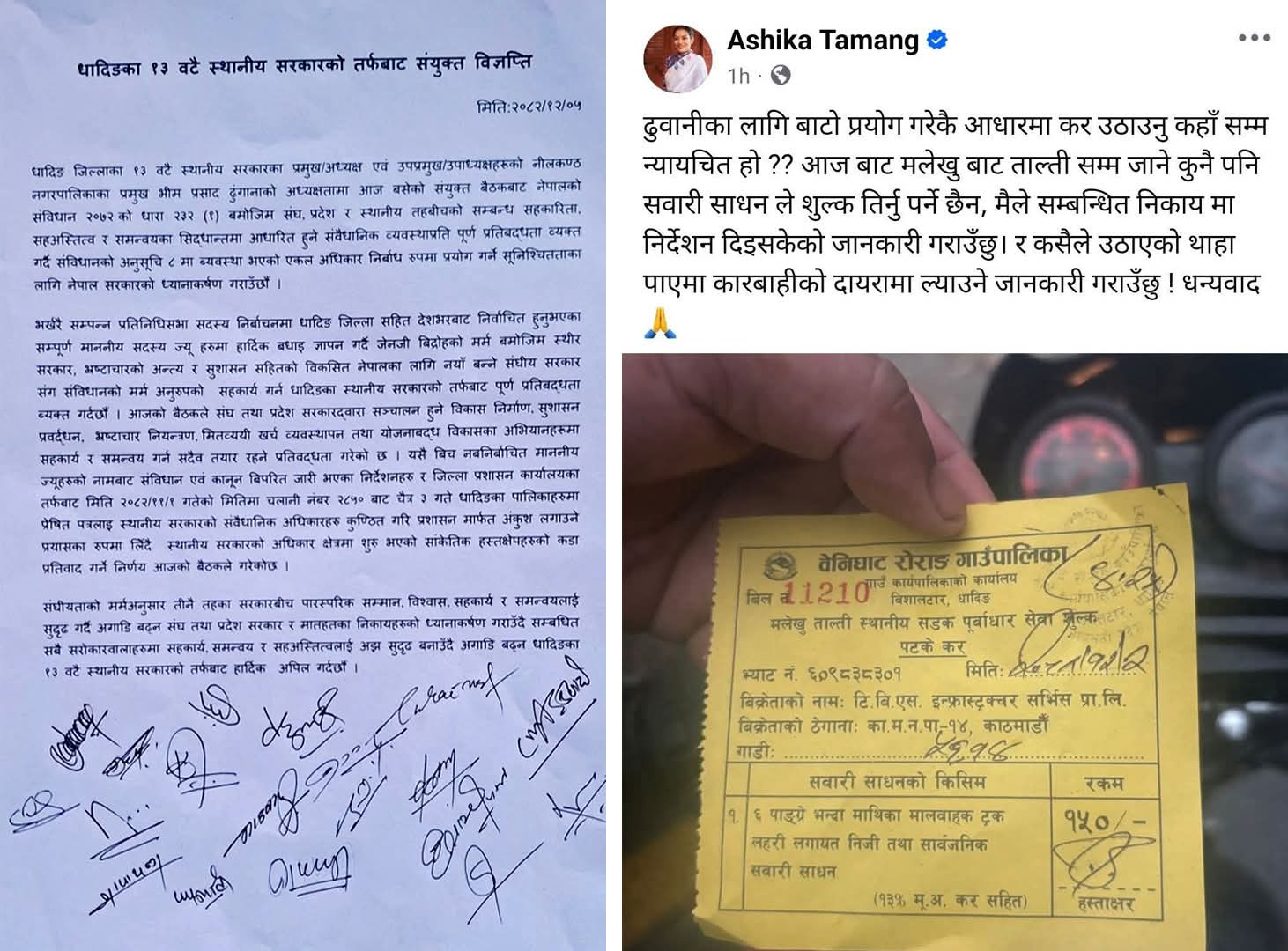 तामाङले ‘ढुवानीका लागि बाटो प्रयोग गरेकै आधारमा कर उठाउनु कहाँसम्म न्यायचित हो ? आजबाट मलेखुबाट ताल्तीसम्म जाने कुनै पनि सवारी साधनले शुल्क तिर्नु पर्ने छैन, मैले सम्बन्धित निकायमा निर्देशन दिइसकेको जानकारी गराउँछु। र कसैले उठाएको थाहा पाएमा कारबाहीको दायरामा ल्याउने जानकारी गराउँछु’ भन्दै सामाजिक सञ्जाल फेसबुकमा स्टाटस राखेकी थिइन्।