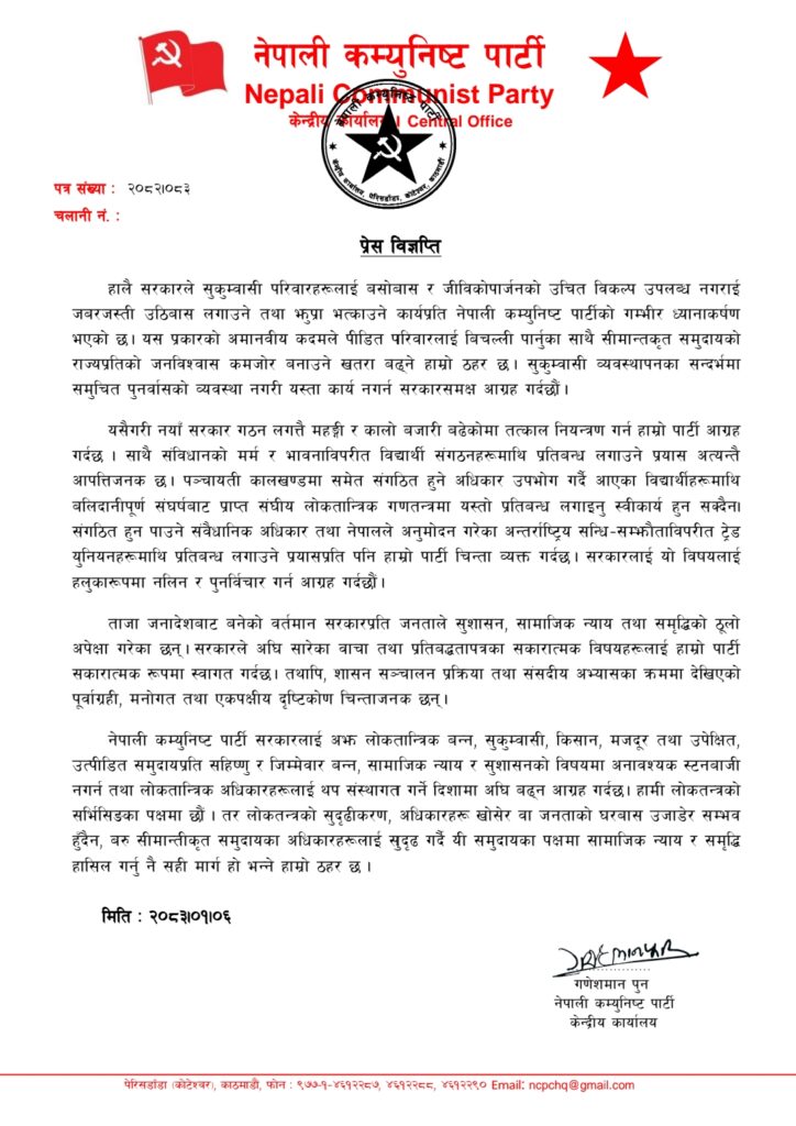 नेपाली कम्युनिष्ट पार्टीले सरकारले हालै देशका विभिन्न स्थानमा सुकुम्बासी परिवारहरूलाई उचित विकल्पबिना उठिबास गराउने तथा झुप्रा भत्काउने कार्य गरेको भन्दै गम्भीर आपत्ति जनाएको छ। पार्टीले आइतबार जारी गरेको प्रेस विज्ञप्तिमा यस्तो कदमलाई “अमानवीय” भन्दै तत्काल रोक्न र पुनर्वासको व्यवस्था गर्न सरकारसँग माग गरेको छ।