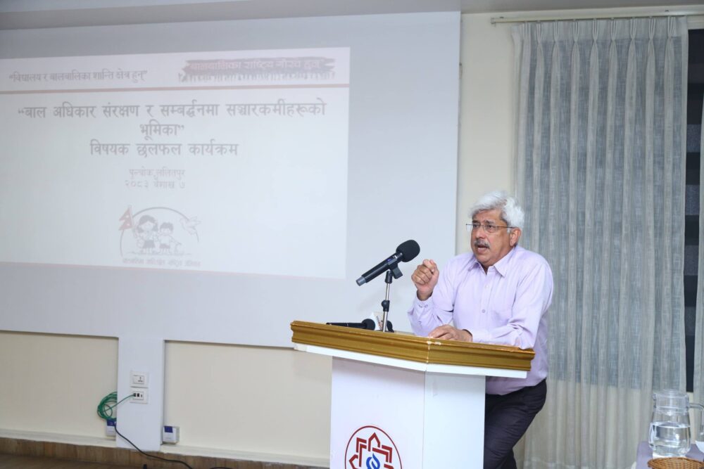 बालबालिका शान्ति क्षेत्र अभियानका अध्यक्ष पौडेलले बालबालिकाले सुरक्षित वातावरणमा निर्धक्क भएर बाँच्न पाउने, पढ्ने र खेल्ने हुर्कने अधिकारसहित स्वास्थ्य, शिक्षा, पोषणको अधिकार सुरक्षाका लागि नागरिक समाज, सञ्चार क्षेत्र र स्थानीय तह र राज्यले गर्नुपर्ने कामको सन्दर्भमा चर्चा गर्नुभयो ।